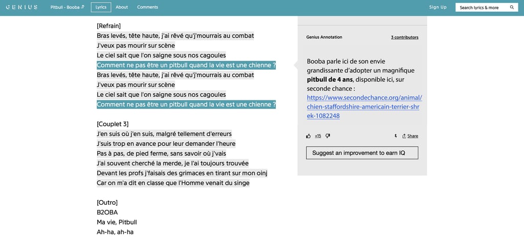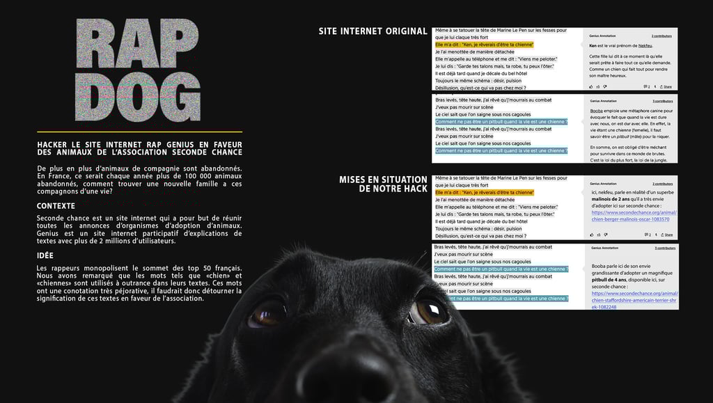 Seconde Chance est un site internet qui a pour but de réunir toutes les annonces d'organismes d'adoption d'animaux. Genius est un site internet participatif d'explications de textes avec plus de 2 millions d'utilisateurs. Le but est de venir détourner la signification de ces textes de rappeur en faveur de l'association.